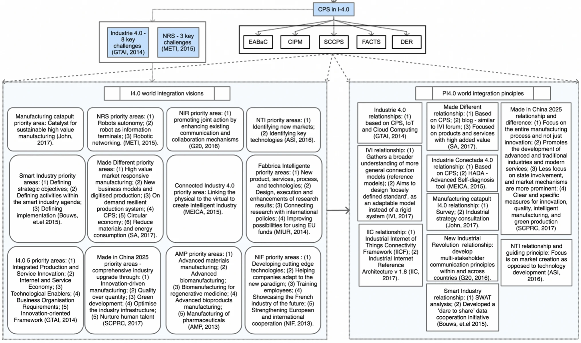 The architecture framework in Figure makes direct recommendations for elements of action, through integrating best practices from the empirical analysis. Figure integrates taxonomic grouping techniques (Figure node 1:1) from academic literature, to establish the CPS integration framework (in Figure node 1.2), with practical initiatives (in Figure node 1:3) from empirical studies data and consolidates these techniques with a cascading framework (in Figure node 1.4) that relates artificial intelligence with CPS technologies. A taxonomic grouping of future and present techniques is conceptualised with existing hierarchical cascading design (Radanliev 2016). By doing this, the leading initiatives are aggregated in integration areas. The integration framework in Figure follows taxonomic approach, in the formulation of encompassing principles for the integration across all initiatives (Figure node 1:3).